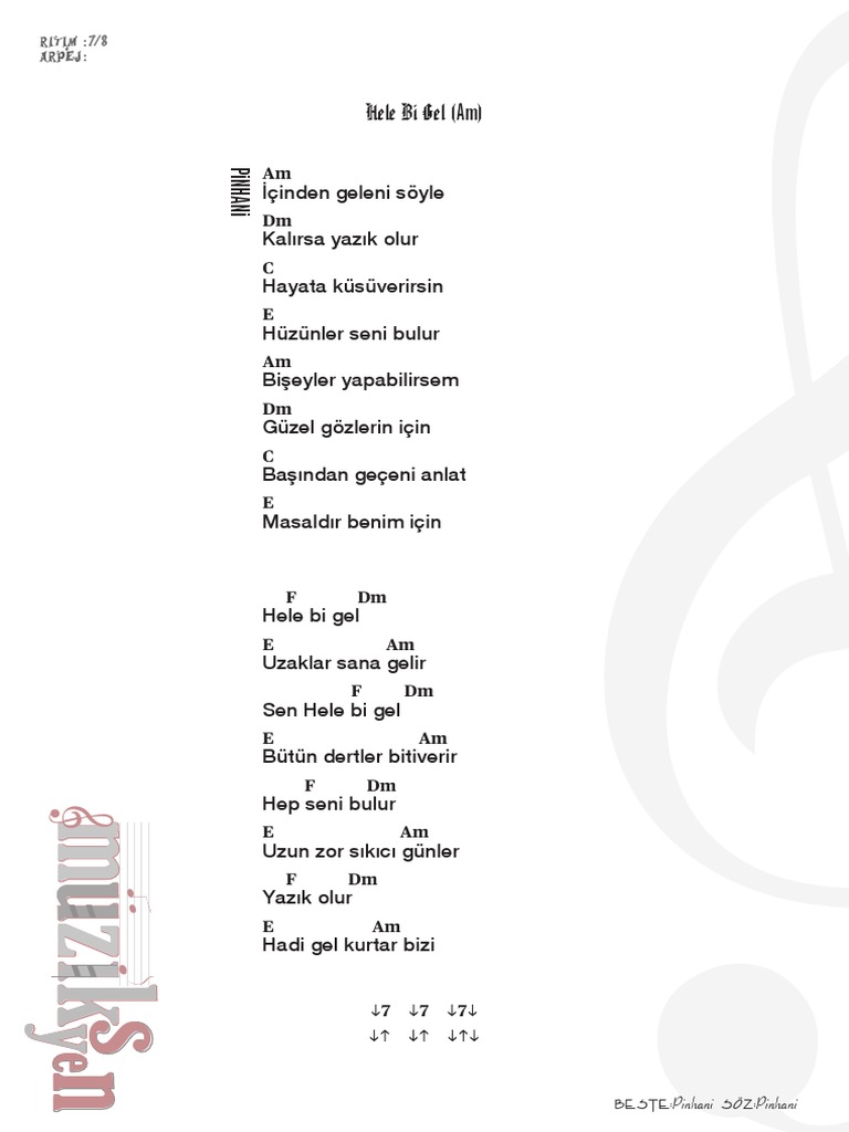 Hele bir gel uzaklar sana gelir sen hele bir gel bütün dertler bitiverir. Bişeyler yapabilirsem güzel gözlerin için başından geçeni anlat masaldır benim için hele bi gel uzaklar sana gelir sen hele bi gel bütün dertler bitiverir hep seni bulur uzun zor sıkıcı günler yazık olur hadi gel kurtar bizi. Içinden geleni söyle kalırsa yazık olur hayata küsüverirsin hüzünler seni bulur bişeyler yapabilirsem güzel gözlerin için başından geçeni anlat masaldır benim için hele. Sen hele bi gel bütün dertler bitiverir.
