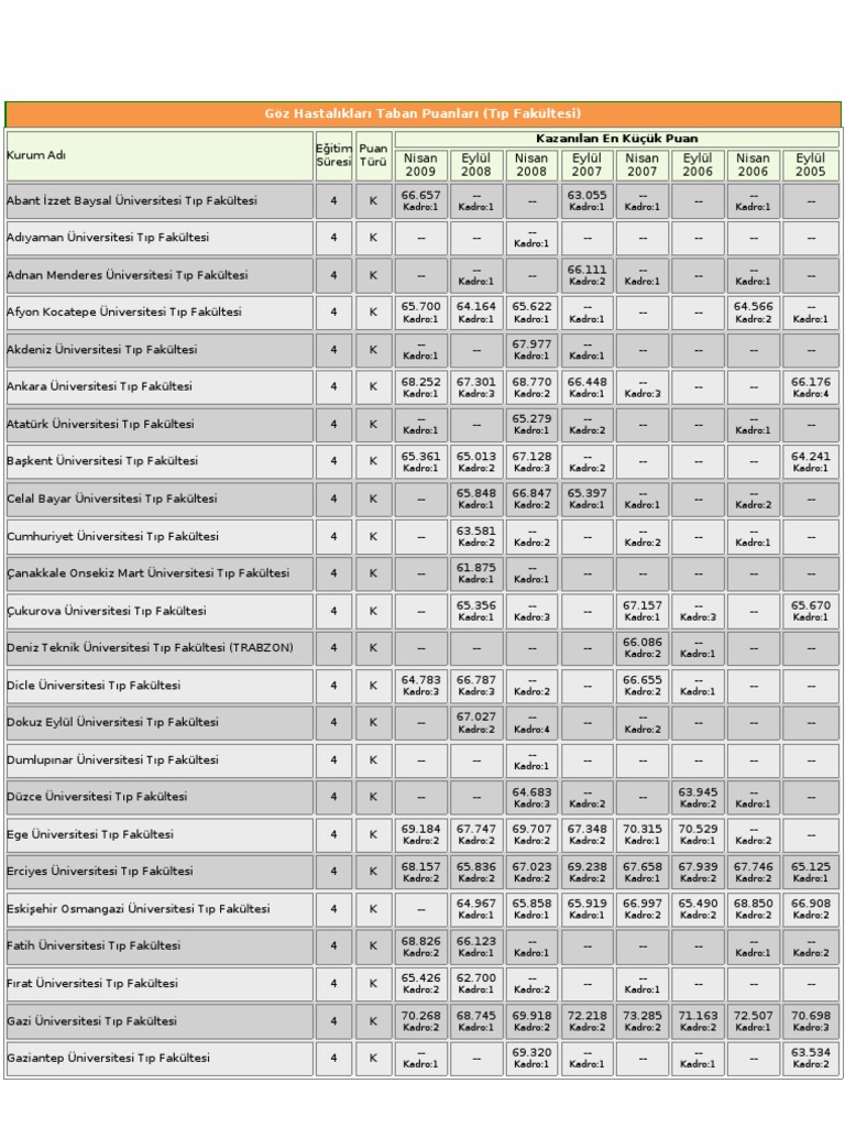 Bu bölümde ihtisas eğitimi veren hastane ve bölümlerin kadro açtığı dönemlerdeki tus kılavuzunda yer alan taban puanları bulunmaktadır. Tus bölüm taban puanları 2020. Göz hastalıkları taban puanları. Boşluklar o bölümün o sınavda kadro açmadığı anlamına gelmektedir.