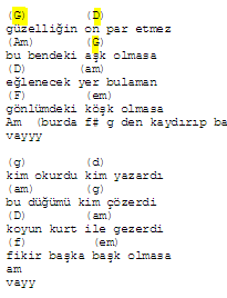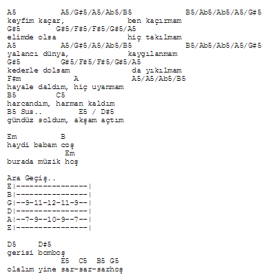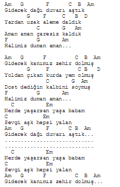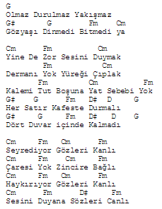 Kafeste durmalı g g fm d d g dört duvar içinde kalmadı cm fm cm fm seyrediyor gözleri kanlı cm fm cm fm çaresi yok zincire bağlı cm fm cm fm haykırıyor gözleri kanlı cm fm d fm sesini duyana sözleri canlı. şimdi gözleri kanlı kusmuk içinde kanatları gm kafamdaki tırtıllar am bir gün oldu kelebek dm besledim ellerimle. Duman akor gitar akorları tab ve notaları. Kafeste durmalı f e dm c b e dört duvar içinde kalmadı am dm am dm seyrediyor gözleri kanlı am dm am dm çaresi yok zincire bağlı am dm am dm haykırıyor gözleri kanlı am dm c dm sesini duyana sözleri canlı rastgele.