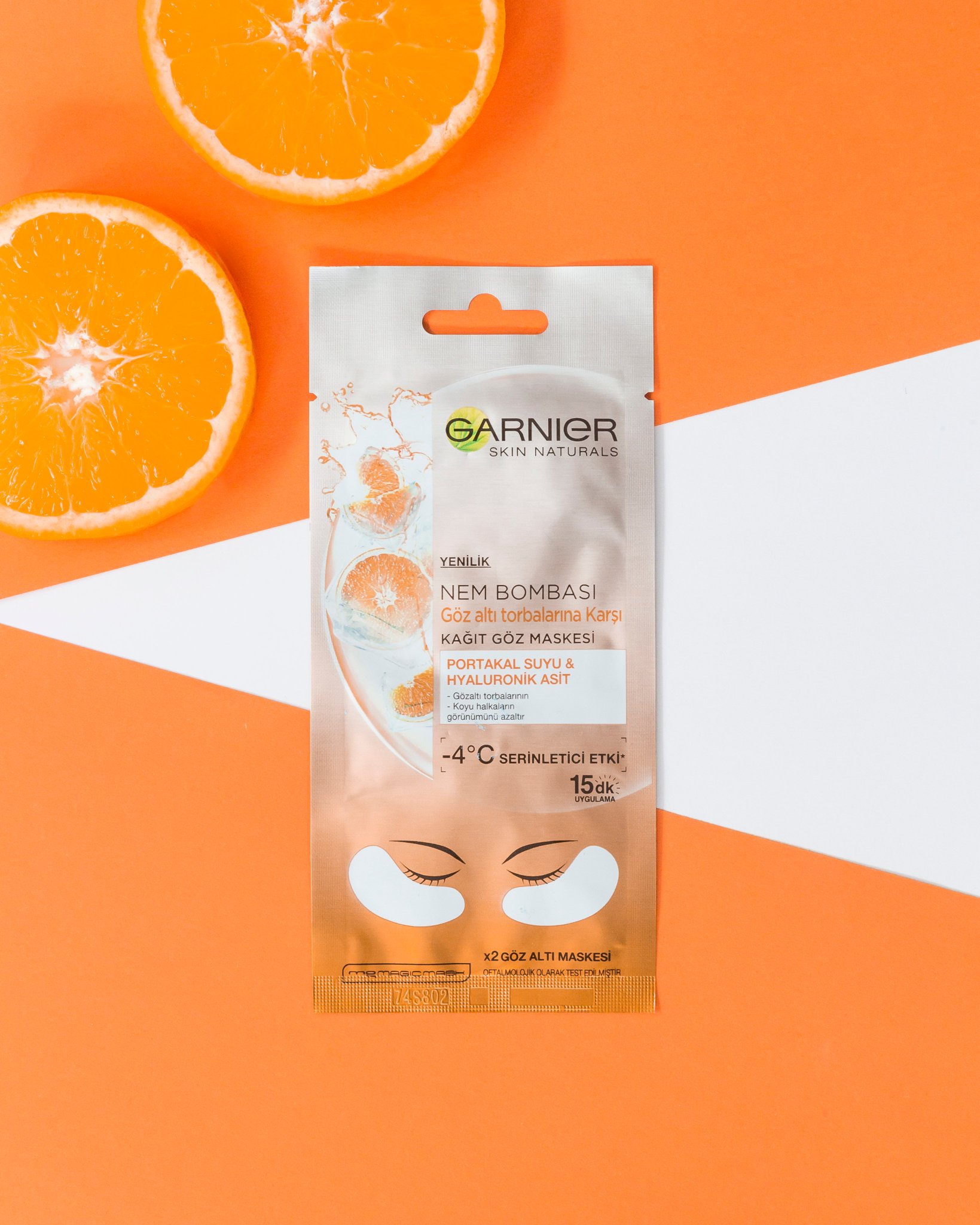 Garnier nem bombası göz altı torbalarına karşı kağıt göz maskesi portakal suyu.