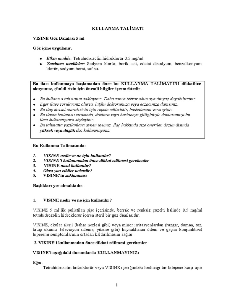 Visine 5 ml lik polietilen ie içerisinde berrak ve renksiz çözelti halinde 0 5 mg ml tetrahidrozolin hidroklorür içeren steril bir göz damlasıdır. Visine göz damlası başta gözdeki kızarıklıklar olmak üzere batma hissi ve göz kaşıntısını kısa sürede geçiren anti bakteriyel bir göz damlasıdır. En ucuz ve basit göz damlası. Ilacın etken maddesi tetrahidrozolin hidroklorür dür visine göz damlası göz içindeki kan damarlarını daraltarak etki gösterir visine mevsimsel alerjik konjonktivit oküler alerji veya yüzme toz duman ve rüzgara bağlı göz tahrişleri ile fazla okuma televizyon seyretme gibi göz yorgunluğu durumlarında gelişen ikinci derece konjonktiva ödemi ve.